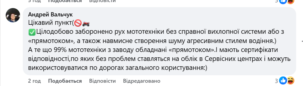 цілодобово заборонено рух мототехніки без справної вихлопної системи або з «прямотоком», а також навмисне створення шуму агресивним стилем водіння;