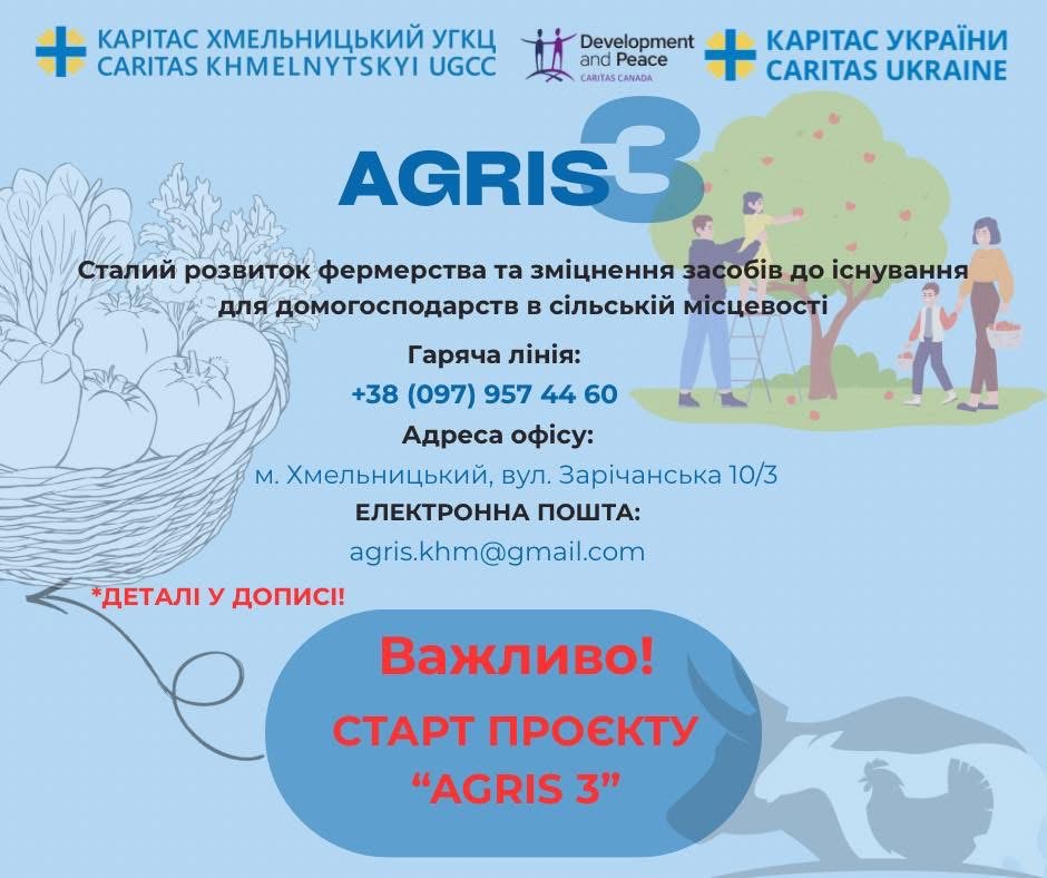 Проєкт AGRIS 3 реалізується Карітас Хмельницький УГКЦ у партнерстві з Caritas Ukraine за фінансової підтримки Development and Peace – Caritas Canada. Це міжнародна солідарність, що працює не на словах, а на конкретний результат — у громадах, селах, домогосподарствах.