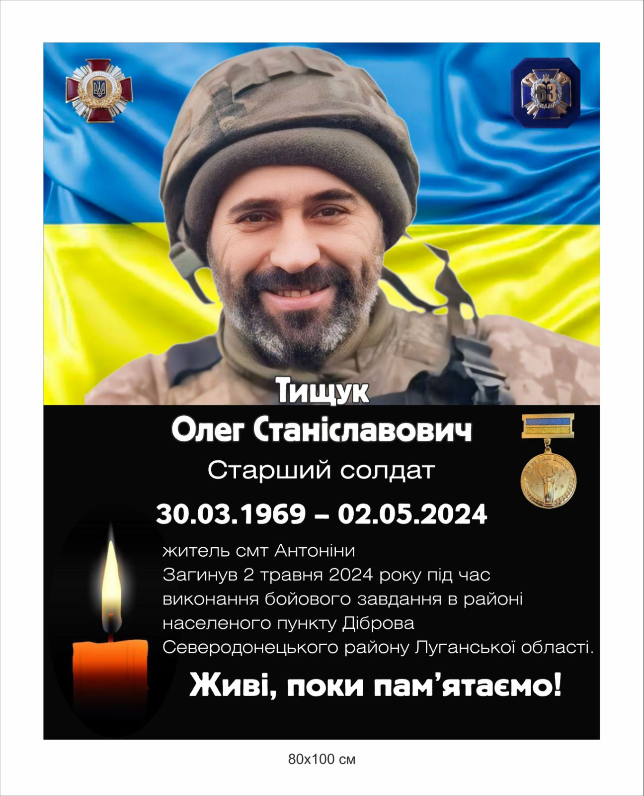 “З перших днів війни Олег мужньо і сміливо боронив рідну землю, домівку, кожного з нас”, – розповідають про земляка у Антонінській громаді. 9 травня 2024 року у засвіти провели військового Олега Тищука. Захисникові було 55 років.