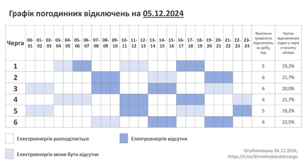 Сьогодні, 5 грудня, на території Хмельницької області знову діятиме графік погодинних відключень світла. Постачання електроенергії планують обмежити для всіх черг споживачів. Про це повідомляє АТ «Хмельницькобленерго».