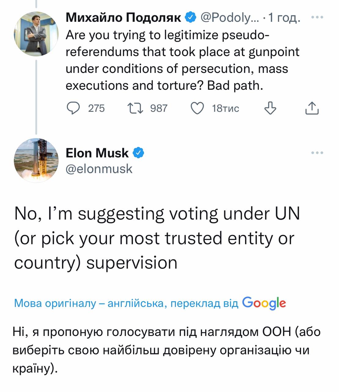 – Українсько-російський мир: провести ще одне голосування в анексованих регіонах під наглядом ООН. Росія залишить ці території, якщо таким буде бажання мешканців. Крим формально стає частиною Росії, так як це було з 1783 року (до помилки Хрущова). Відновлене водопостачання в Крим. Україна лишається нейтральною, – написав Ілон Маск.