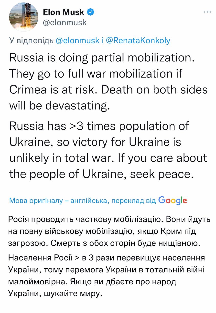 У наступному повідомленні Маск додав, що вважає “швидше всього, таким буде кінцевий результат цієї війни”.