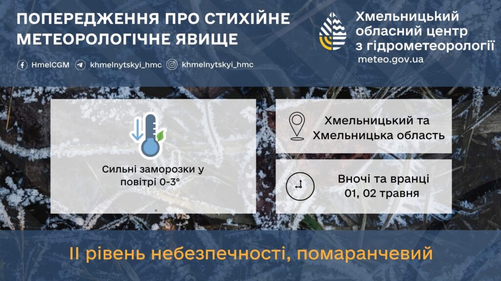 Ніч обіцяє бути по-справжньому холодною — на більшій частині області очікуються сильні заморозки від 0 до 3 градусів морозу. У Хмельницькому температура коливатиметься в межах 0–2 градусів нижче нуля. Вдень повітря прогріється лише до 7–12 градусів тепла по області, а в обласному центрі — до 8–10 градусів.