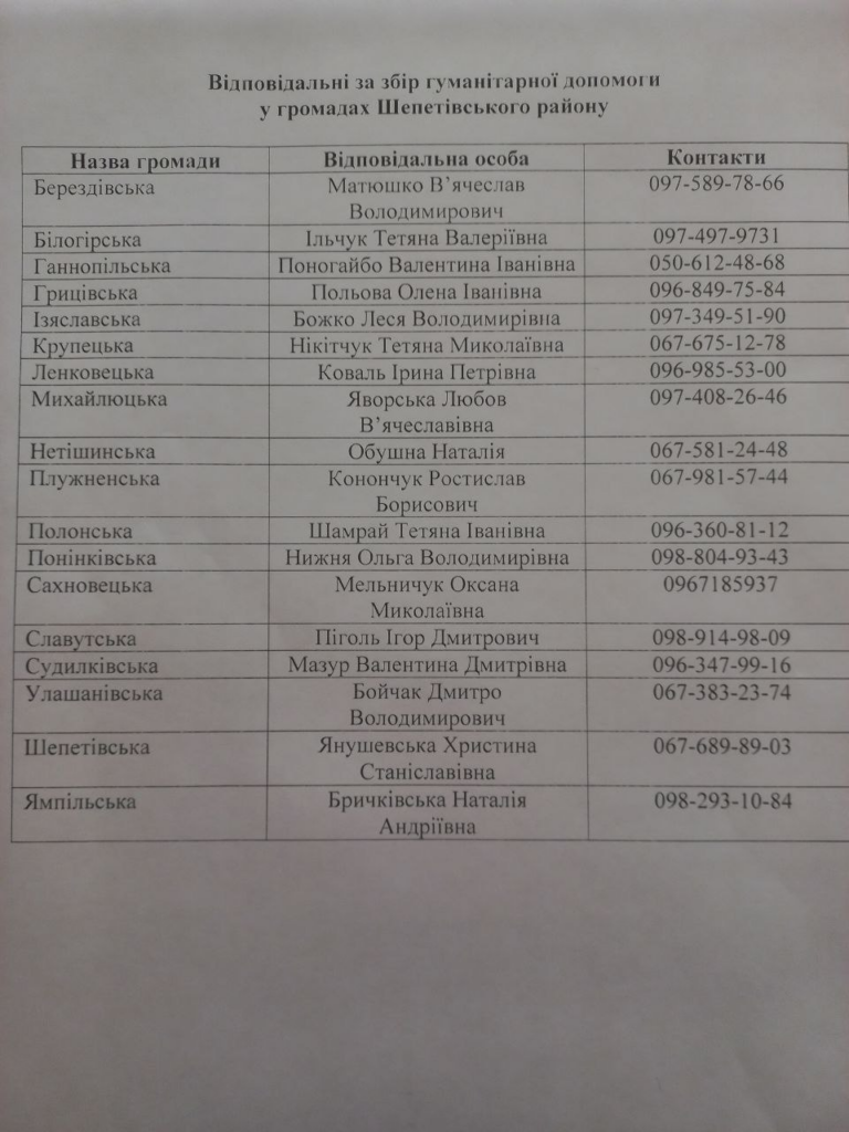 Хто у громадах Шепетівського району відповідає за збір гуманітарної допомоги