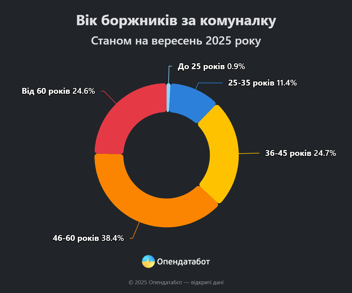Основний тягар комунальних боргів припадає на людей у віці 46–60 років — 302,8 тисячі проваджень (38%). На другому місці – група 36–45 років із 194,7 тис. провадженнями (25%). Майже стільки ж боргів у людей старших за 60 років — 194,1 тисячі (25%).