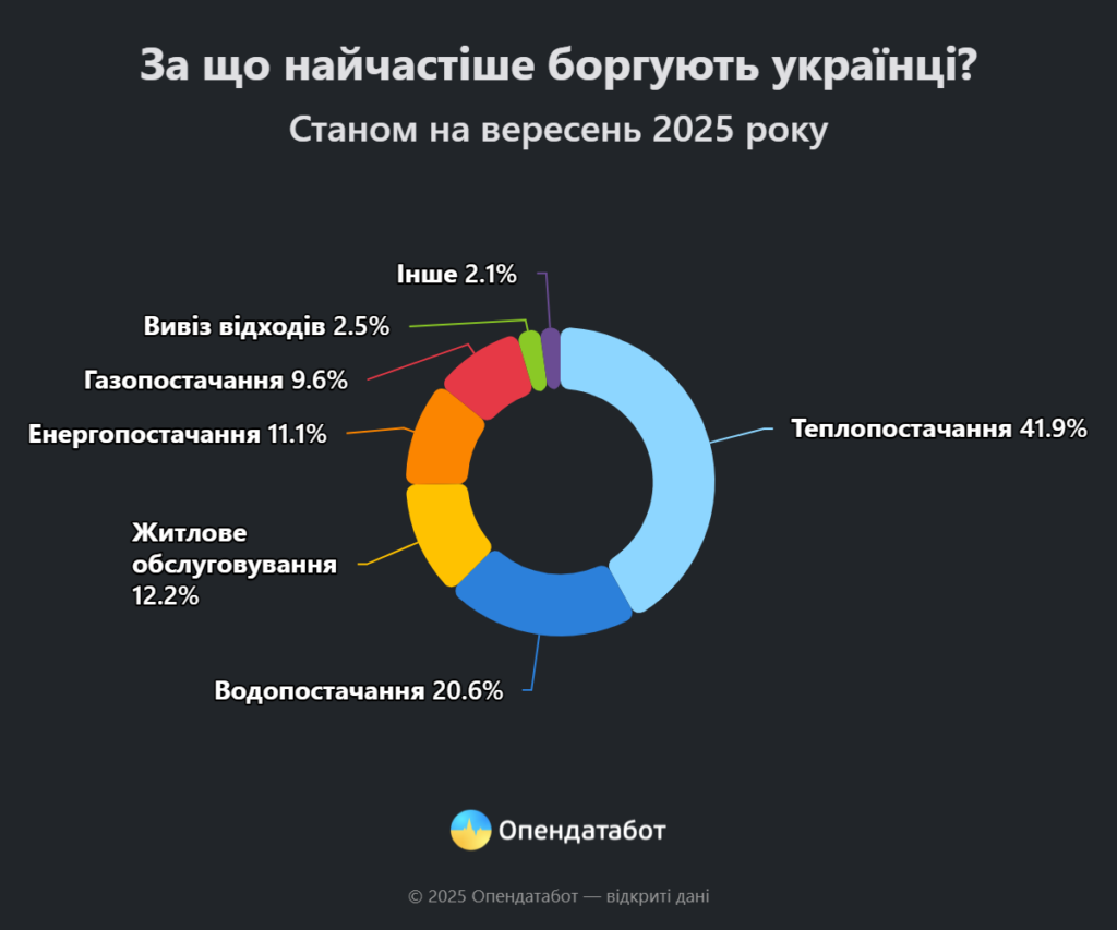 Левова частка заборгованостей стосується теплопостачання — 330 236 випадків (42%). Наслідують борги за воду — 162 455 (21%) та житлове обслуговування — 96 265 (12%). Також значні борги є за енергопостачання (87 708) та газ (75 522).