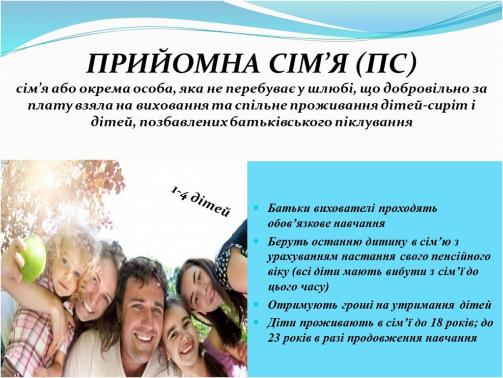 Прийомна сім’я створюється, коли подружжя або окрема особа беруть на виховання та спільне проживання від однієї до чотирьох дітей-сиріт чи дітей, позбавлених батьківського піклування.