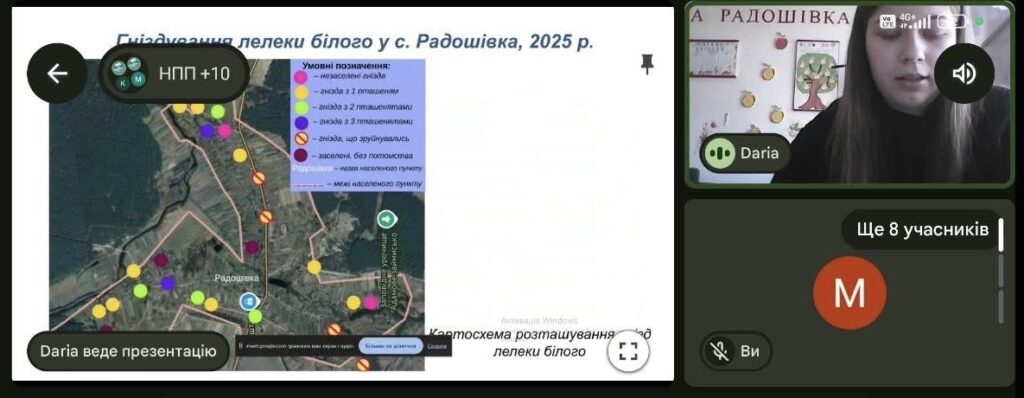 Дар’я Цибуля представила дослідження на тему, близьку кожному жителю Шепетівського району: «Гніздування популяції лелеки білого (Ciconia ciconia L.) в межах села Радошівка». Дівчина вивчала особливості життя, чисельність та умови гніздування птахів, які вже давно стали невід’ємною частиною місцевого ландшафту.