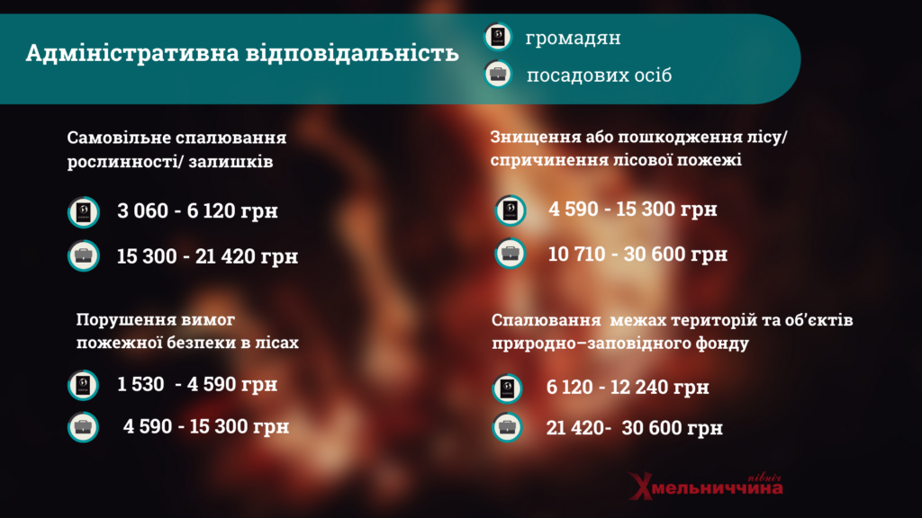 Окрім того, статтею 245 Кримінального кодексу України передбачена кримінальна відповідальність за знищення або пошкодження лісових масивів, зелених насаджень навколо населених пунктів, вздовж залізниць, а також стерні, сухих дикоростучих трав, рослинності або її залишків вогнем чи іншим загально-небезпечним способом. Винні особи караються штрафом від 5100 грн до 8500 грн, або обмеженням волі на строк від 2 до 5 років, або позбавленням волі на той самий строк. Такі ж дії, якщо вони спричинили загибель людей, масову загибель тварин або інші наслідки, караються позбавленням волі на строк від 5 до 10 років.