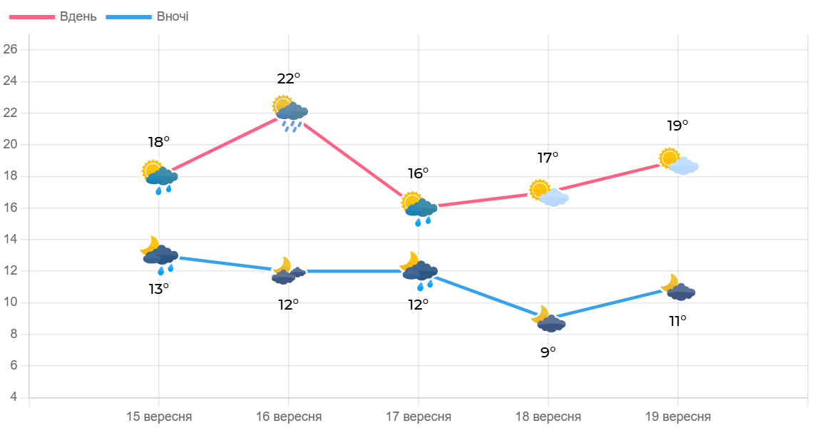 За прогнозом Українського гідрометеорологічного центру хмарна погода та опади триватимуть у нашому регіоні щонайменше до п’ятниці. Тож, майте при собі дощовик і не забувайте затишно одягнутись – найтепліше буде у вівторок, 16 вересня, далі дні стануть осіннішими.