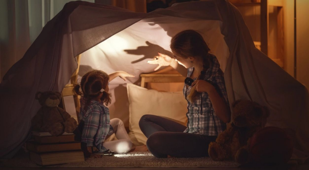 - Грати в тіньовий театр, використовуючи іграшки. Треба підсвічувати їх, аби була тінь.