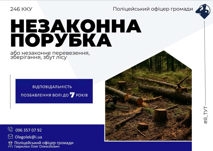- Незаконна порубка, перевезення, зберігання або збут деревини — покарання до 7 років позбавлення волі.