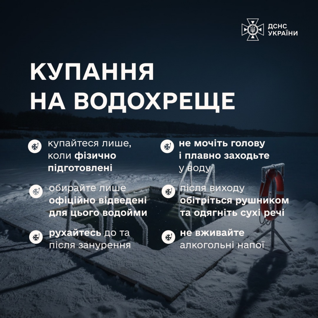 «6 січня за давньою традицією українці пірнатимуть в ополонки, вшановуючи свято та загартовуючи дух, – говорять надзвичайники і підкреслюють, – купання у крижаній воді – небезпечне. Будьте уважні та обережні: обирайте лише безпечні місця, зважайте на стан здоров’я та дотримуйтеся правил безпеки».