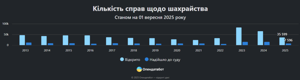 Опираючись на дані ГПУ, Опендатабот наводить статистику за 8 місяців 2025 року. За цей період відкрили понад 35 тисяч кримінальних проваджень за ст. 190 ККУ «Шахрайство».