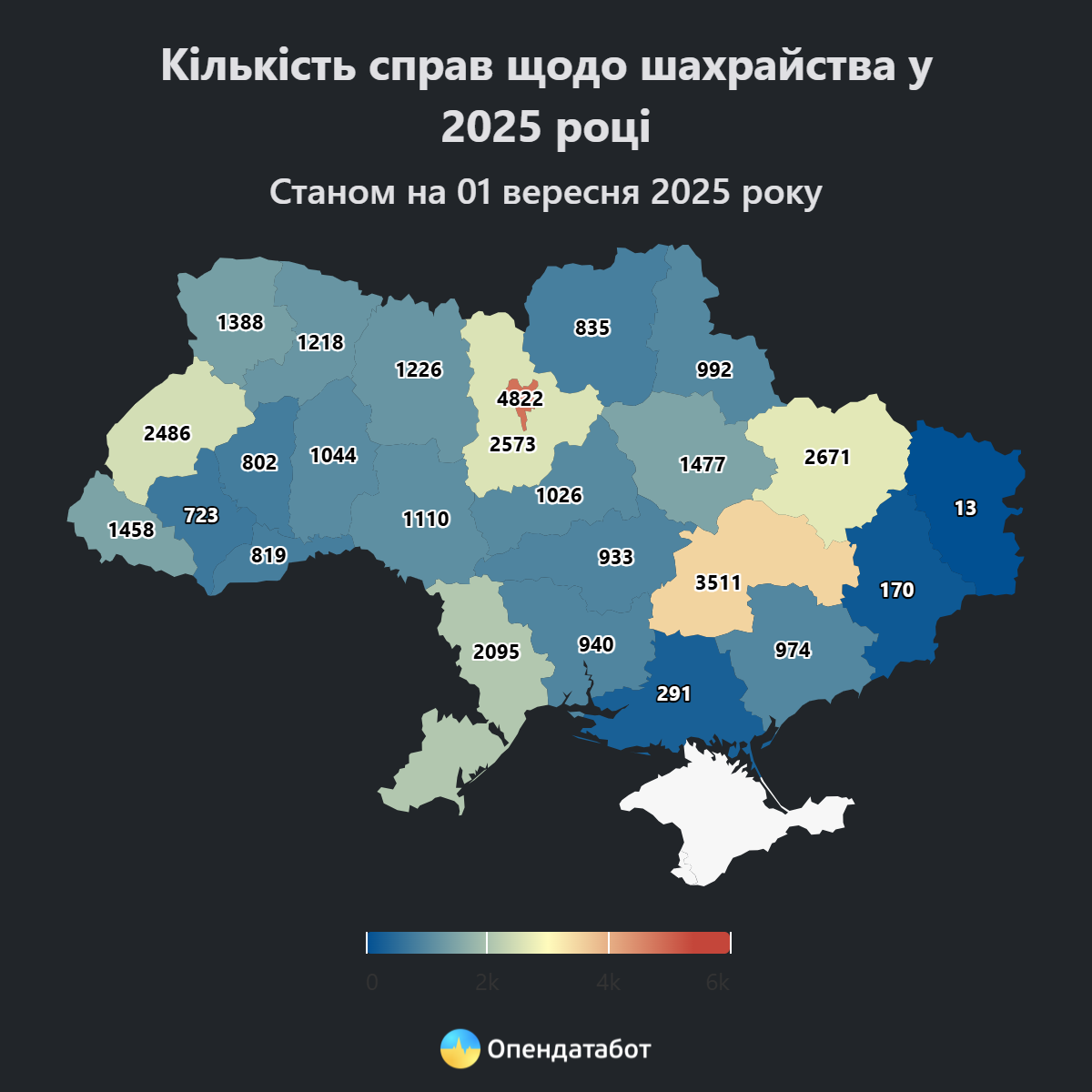 Опираючись на дані ГПУ, Опендатабот наводить статистику за 8 місяців 2025 року. За цей період відкрили понад 35 тисяч кримінальних проваджень за ст. 190 ККУ «Шахрайство».