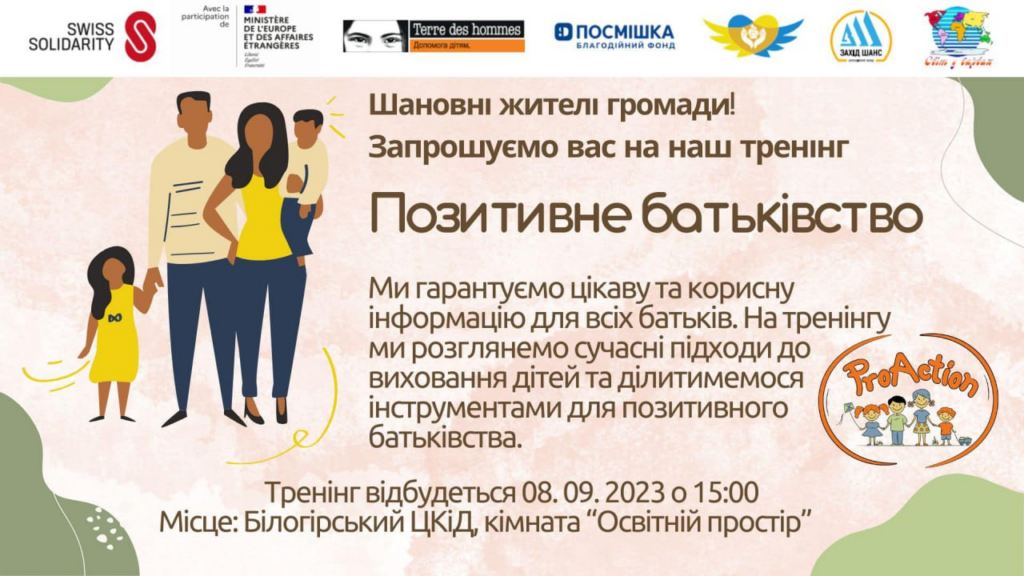 8 вересня 2023 року о 15:00 в “Освітньому просторі” білогірського ЦКіД відбудеться тренінг “Позитивне батьківство”. Цікава та корисна інформація, сучасні підходи виховання дітей, впровадження нових інструментів батьківства. Про все це можна дізнатись, відвідавши захід.