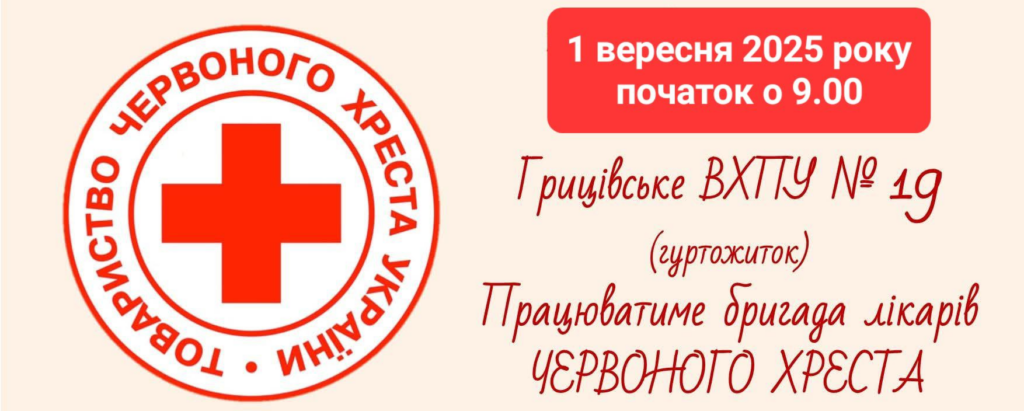 1 вересня 2025 року мешканці Грицівської громади матимуть можливість отримати медичну допомогу від виїзної бригади лікарів Червоного Хреста. Прийом відбуватиметься у приміщенні гуртожитку Грицівського ВХПУ №19. Початок роботи — о 9:00.