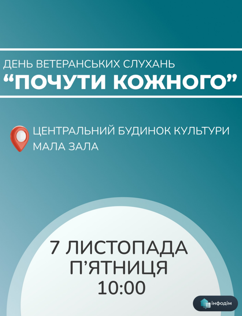 Інформаційно-консультаційний центр «Інфодім» запрошує ветеранів Полонської територіальної громади долучитися до Дня ветеранських слухань «Почути кожного», який відбудеться 7 листопада (пʼятниця) о 10:00 у малій залі Центрального будинку культури.