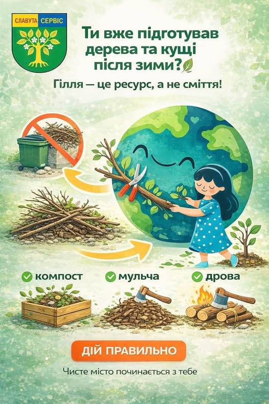 Весна — час оновлення природи та активного впорядкування прибудинкових територій. У Славуті стартував сезон обрізки дерев та кущів. Проте екологічна культура — це не лише вчасно зрізана гілка, а й правильне поводження з нею. Фахівці КП «Славута-Сервіс» нагадують: порядок у місті починається з кожного з нас.