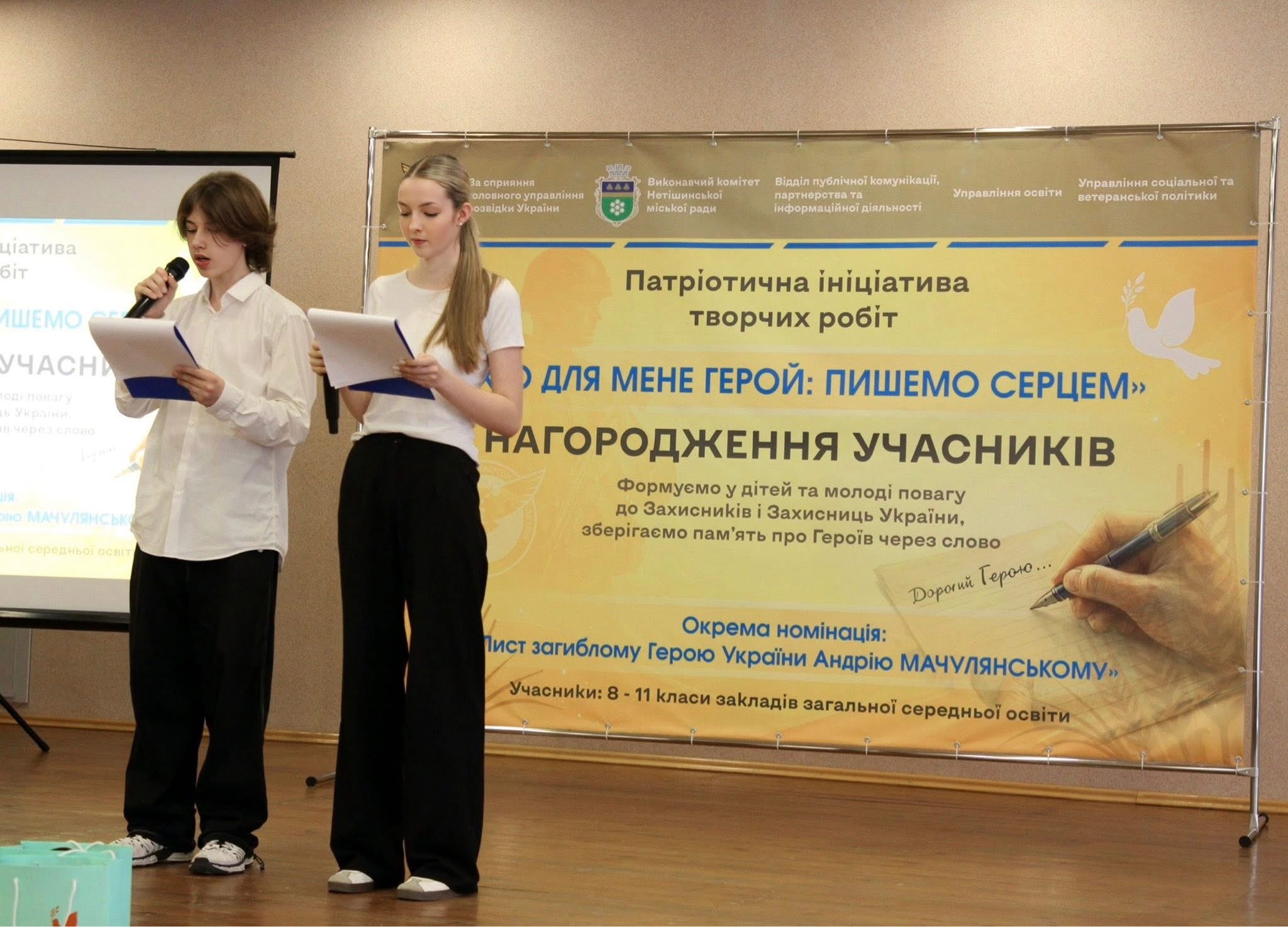 У Нетішинській громаді вперше відбулася особлива патріотична ініціатива, під час якої учні писали про Героїв України серцем. Церемонія нагородження учасників проєкту «Хто для мене Герой: пишемо серцем» відбулася у Нетішинському академічному ліцеї та зібрала школярів 8–11 класів усіх закладів загальної середньої освіти громади.