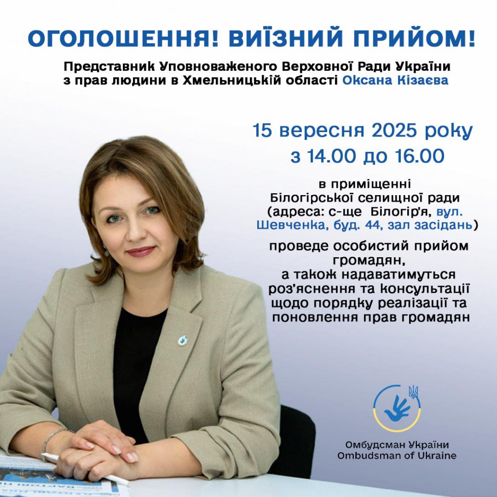 15 вересня 2025 року з 14:00 до 16:00 у приміщенні Білогірської селищної ради (с-ще Білогір’я, вул. Шевченка, 44, зал засідань) відбудеться виїзний прийом громадян. Його проведе Представник Уповноваженого Верховної Ради України з прав людини в Хмельницькій області Оксана Кізаєва.