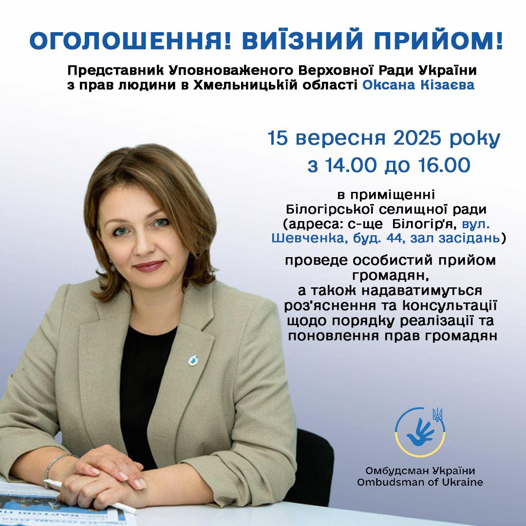 15 вересня 2025 року з 14:00 до 16:00 у приміщенні Білогірської селищної ради (с-ще Білогір’я, вул. Шевченка, 44, зал засідань) відбудеться виїзний прийом громадян. Його проведе Представник Уповноваженого Верховної Ради України з прав людини в Хмельницькій області Оксана Кізаєва.
