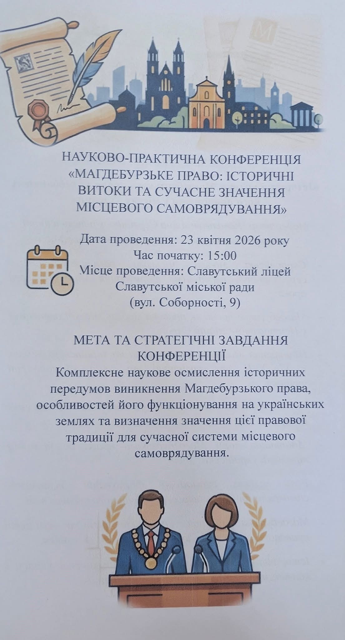 23 квітня Славута стала простором для глибокого діалогу між минулим і сучасністю. На базі Славутського ліцею відбулася науково-практична конференція, присвячена Магдебурзькому праву — явищу, яке століттями формувало обличчя європейських міст і стало фундаментом місцевого самоврядування на українських землях.
