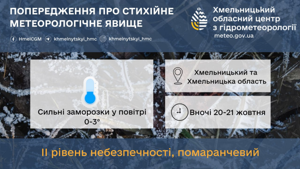 “Вночі 20-21 жовтня – сильні заморозки у повітрі: 0-3º (ІІ рівень небезпечності, помаранчевий)“, – йдеться у повідомленні.