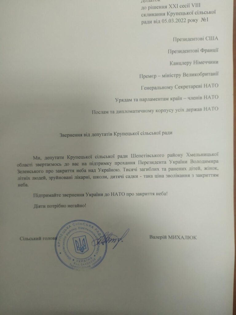 Головна » Актуально » » Закрити небо над Україною: депутати Крупецької громади звернулись до НАТО, Президентів США та Європейських країн